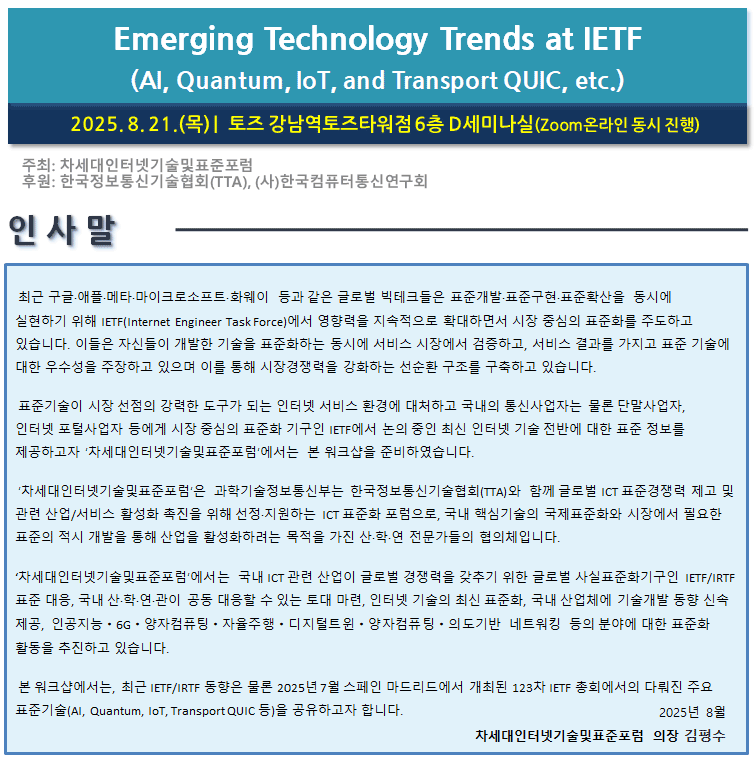 [Â÷¼¼´ëÀÎÅͳݱâ¼ú¹×Ç¥ÁØÆ÷·³] Emerging Technology Trends at IETF (AI, Quantum, IoT, and Transport QUIC, etc.)(2025.8.21.(¸ñ), ¿Â¿ÀÇÁ¶óÀÎ)