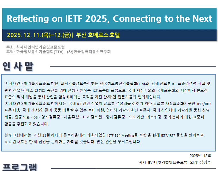 [Â÷¼¼´ëÀÎÅͳݱâ¼ú¹×Ç¥ÁØÆ÷·³] Reflecting on IETF 2025, Connecting to the Next(2025.12.11.(¸ñ)~12.(±Ý), ºÎ»ê È£¸Þ¸£½º È£ÅÚ)