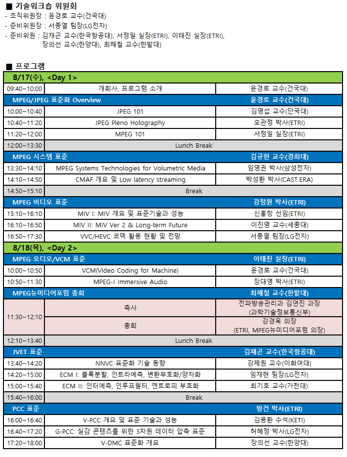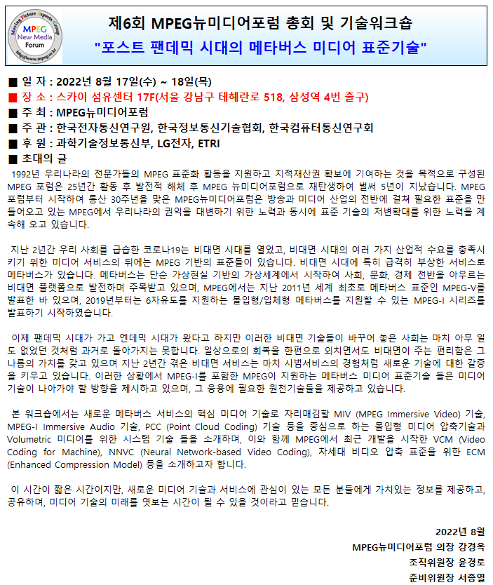 Á¦6ȸ MPEG´º¹Ìµð¾îÆ÷·³ ÃÑȸ ¹× ±â¼ú¿öÅ©¼ó(2022.8.17.(¼ö)~18.(¸ñ), ½ºÄ«À̼¶À¯¼¾ÅÍ)