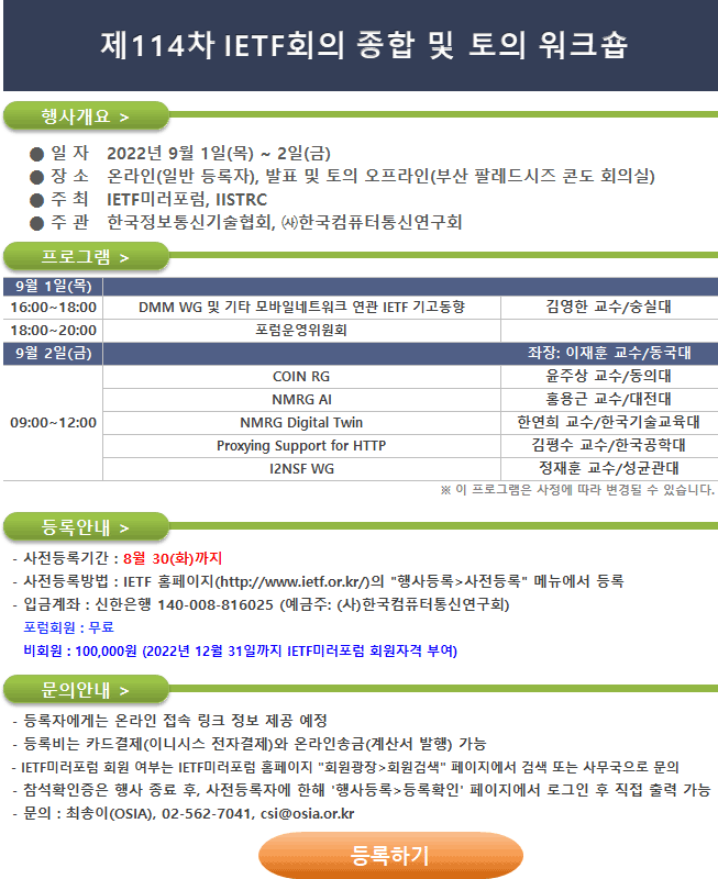 [IETF¹Ì·¯Æ÷·³] Á¦114Â÷ IETFȸÀÇ Á¾ÇÕ ¹× ÅäÀÇ ¿öÅ©¼ó(2022.9.1.(¸ñ)~2.(±Ý))